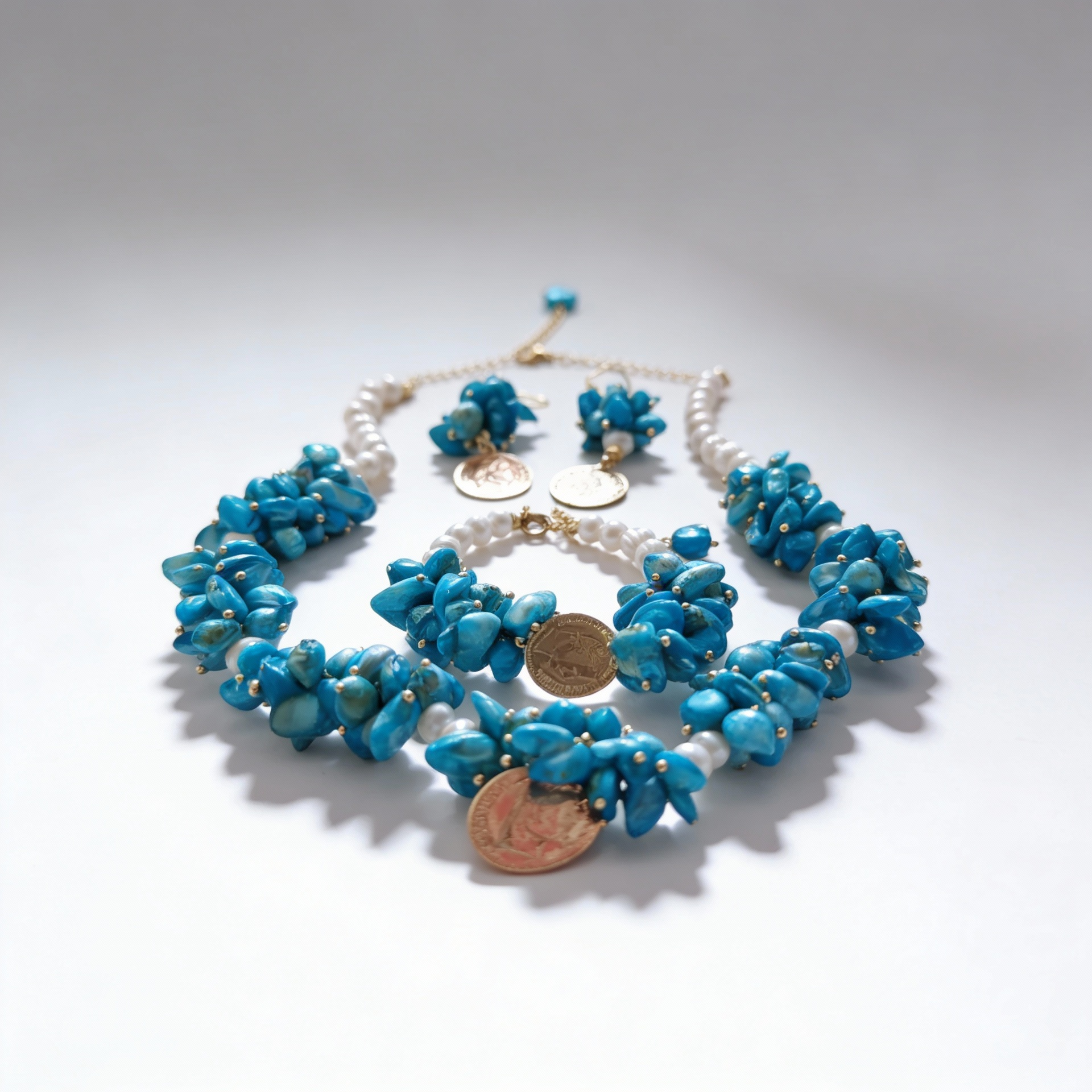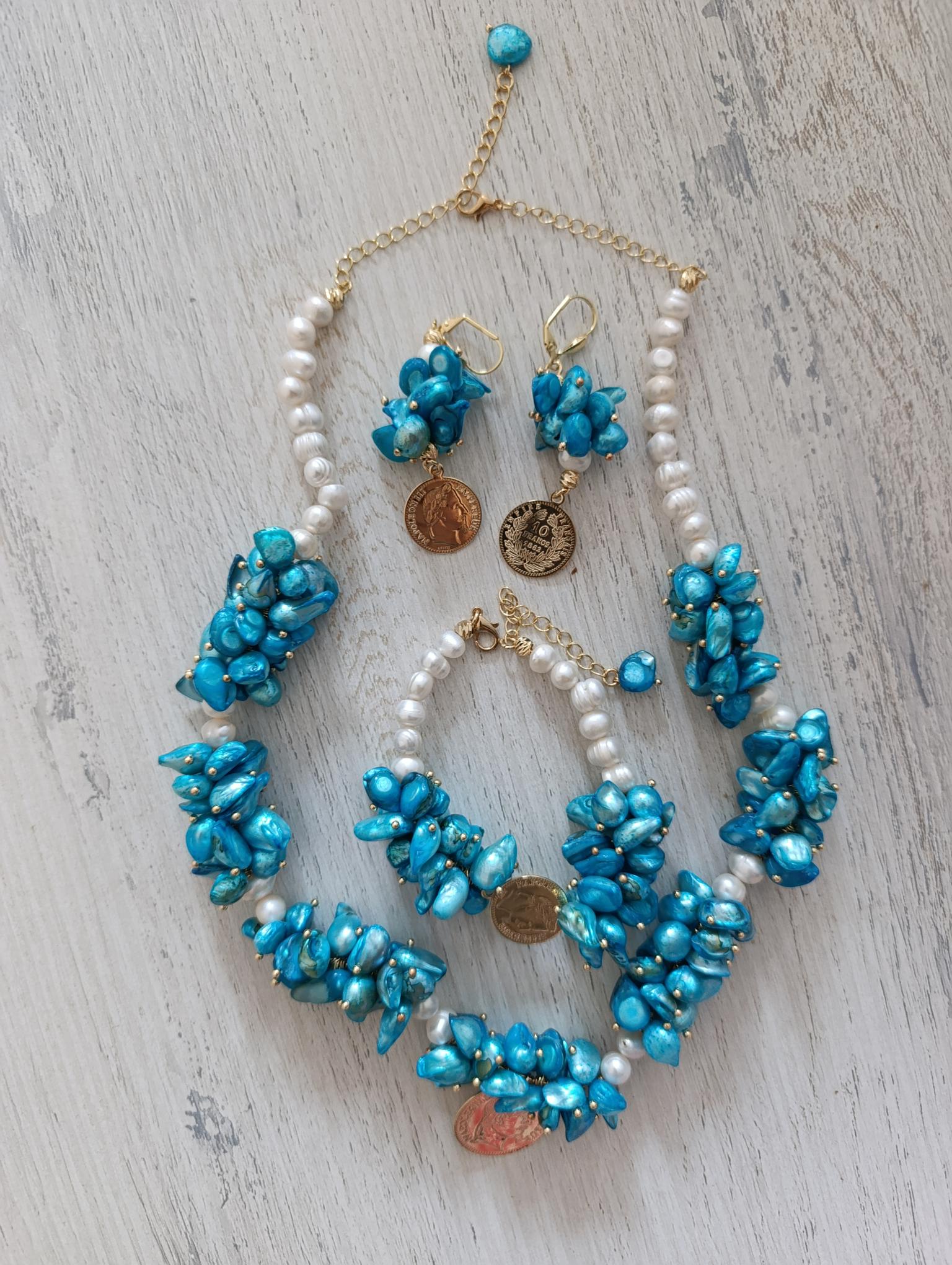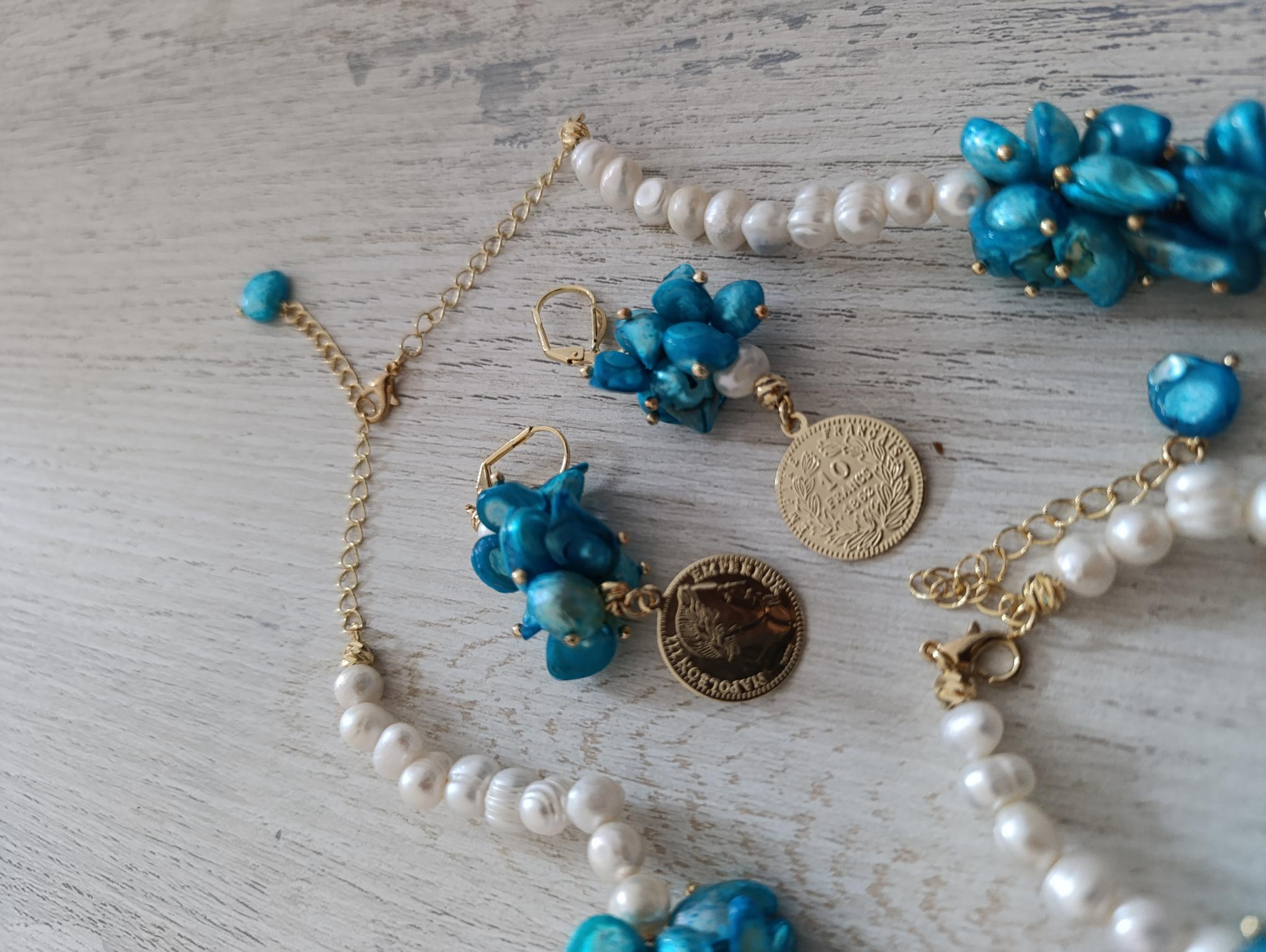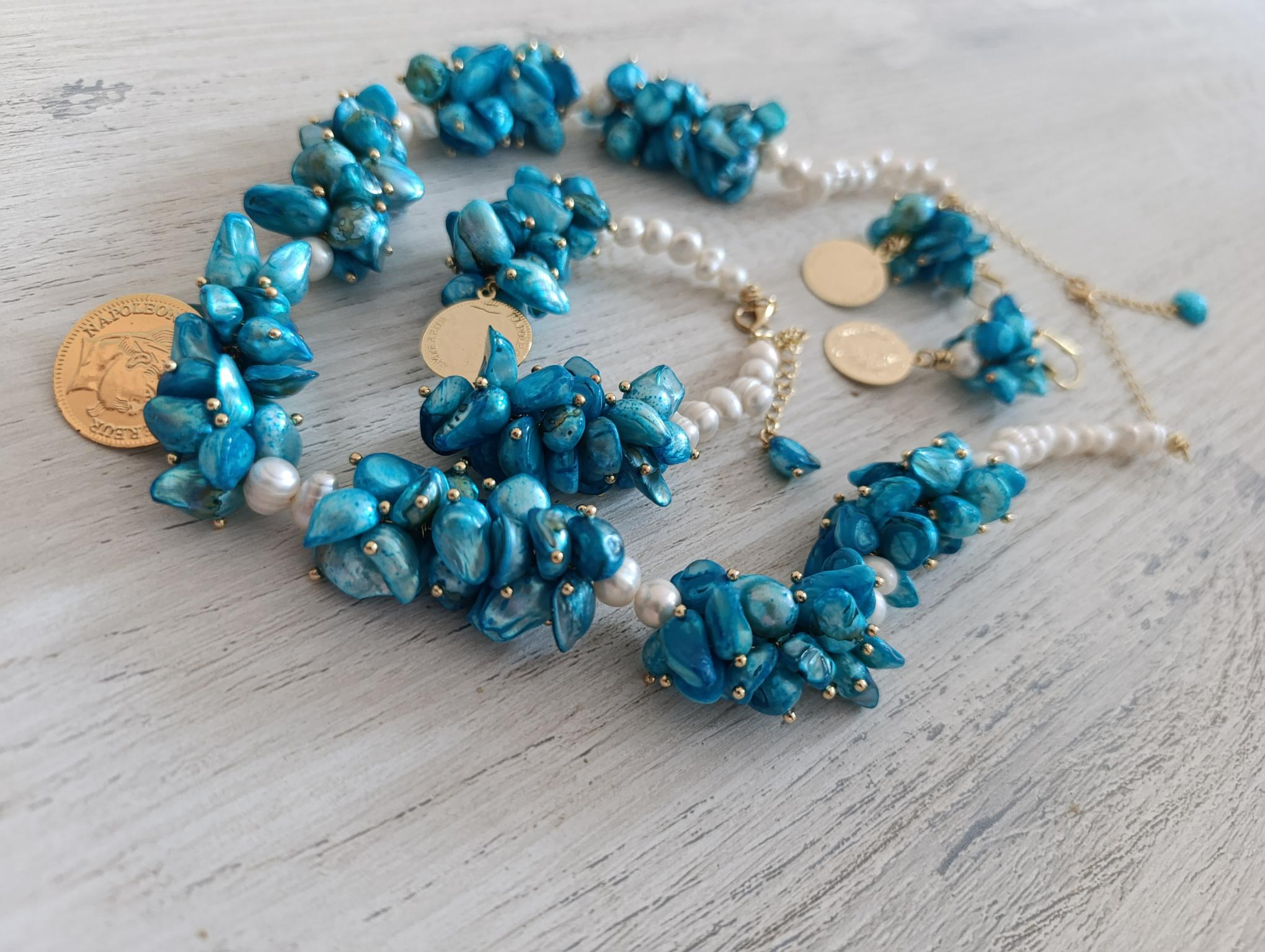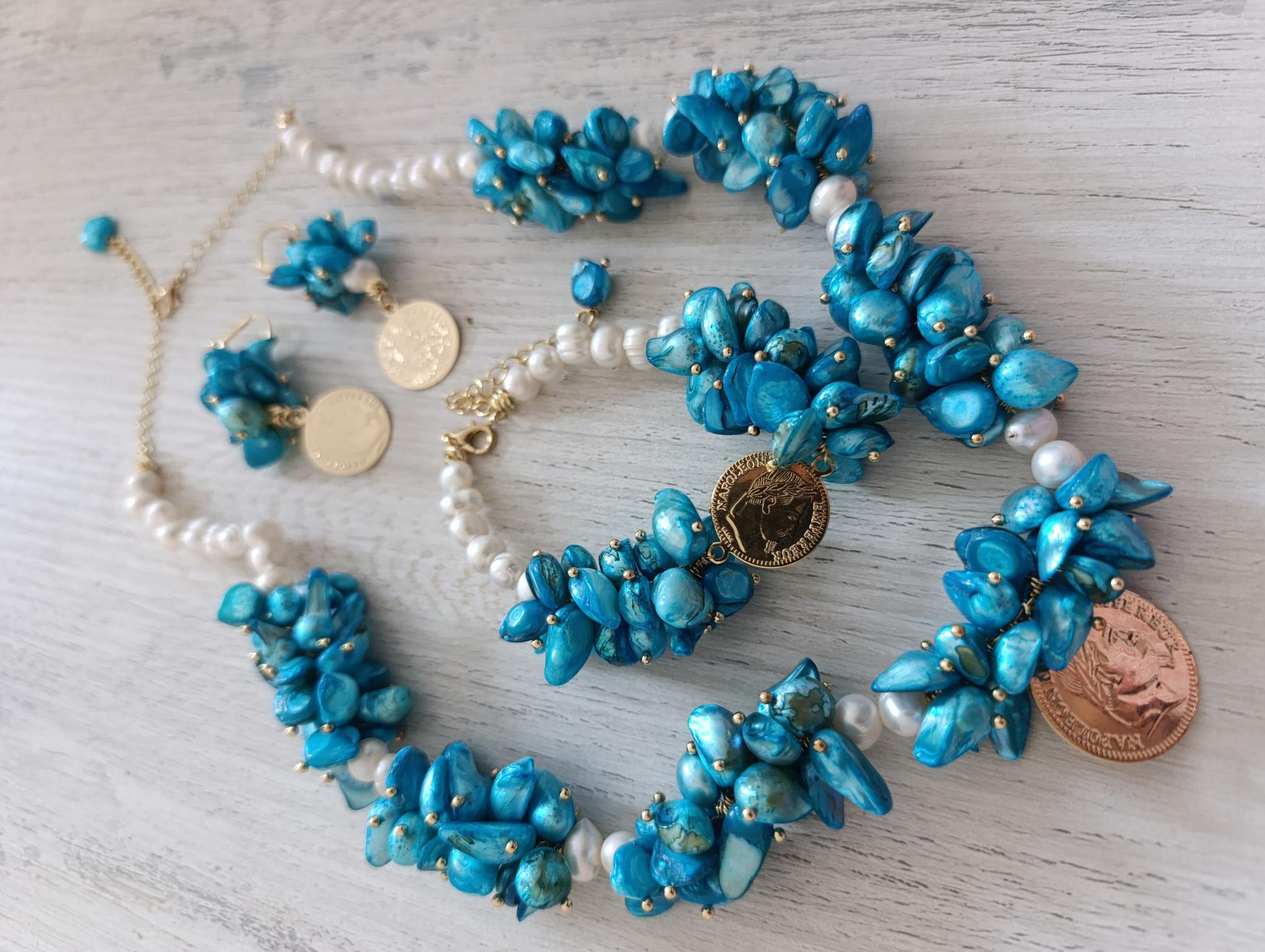 طقم dents de mer أزرق مع اللؤلؤ و البلاكيور مع موتيف