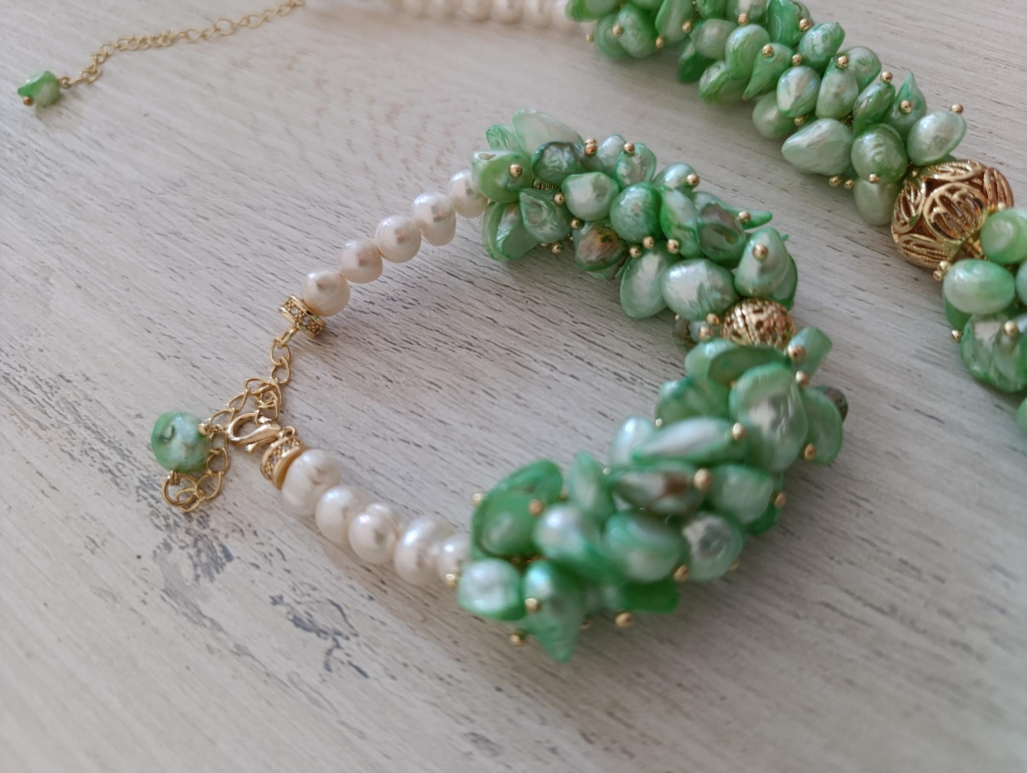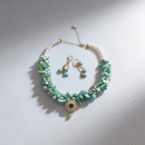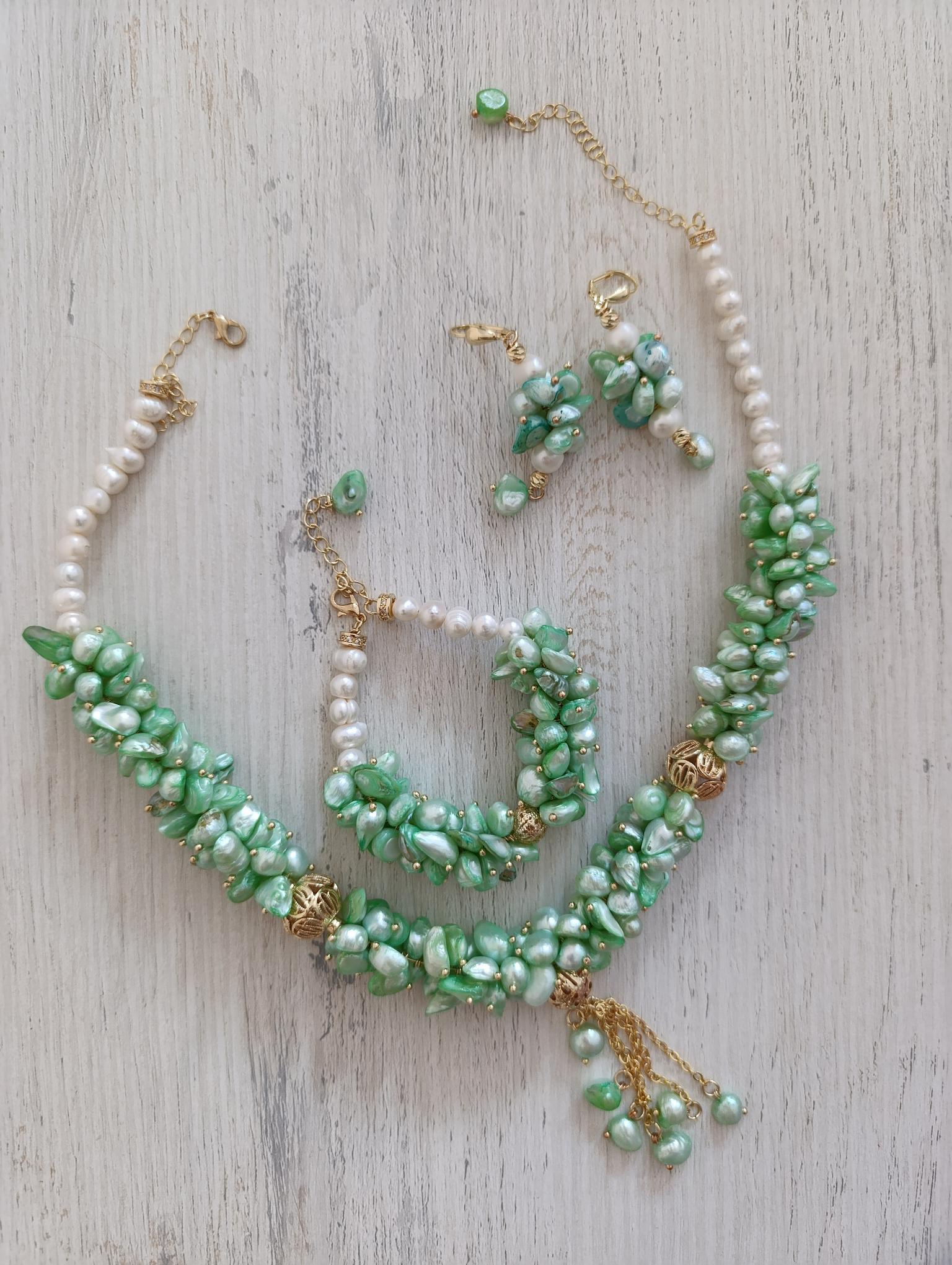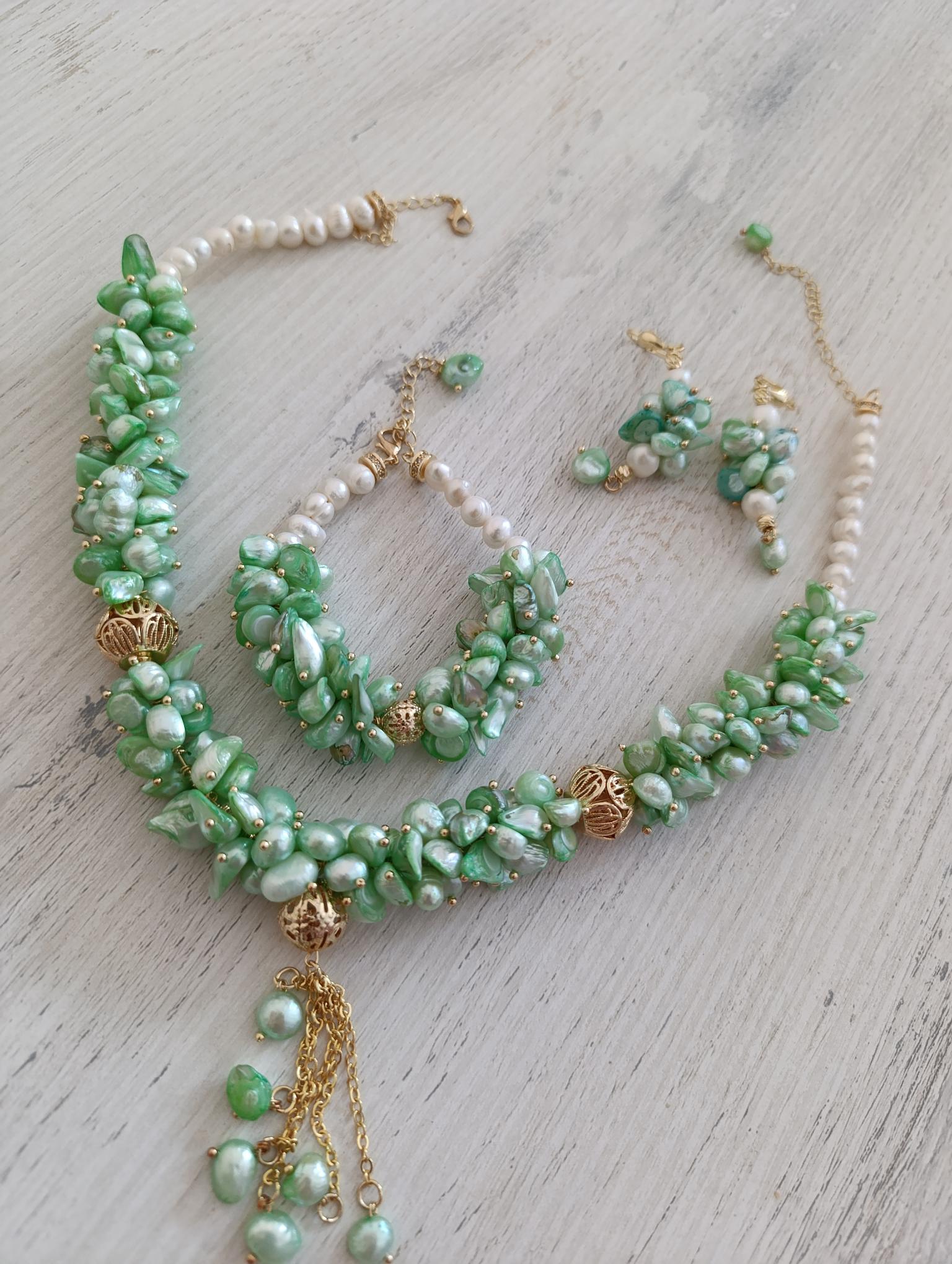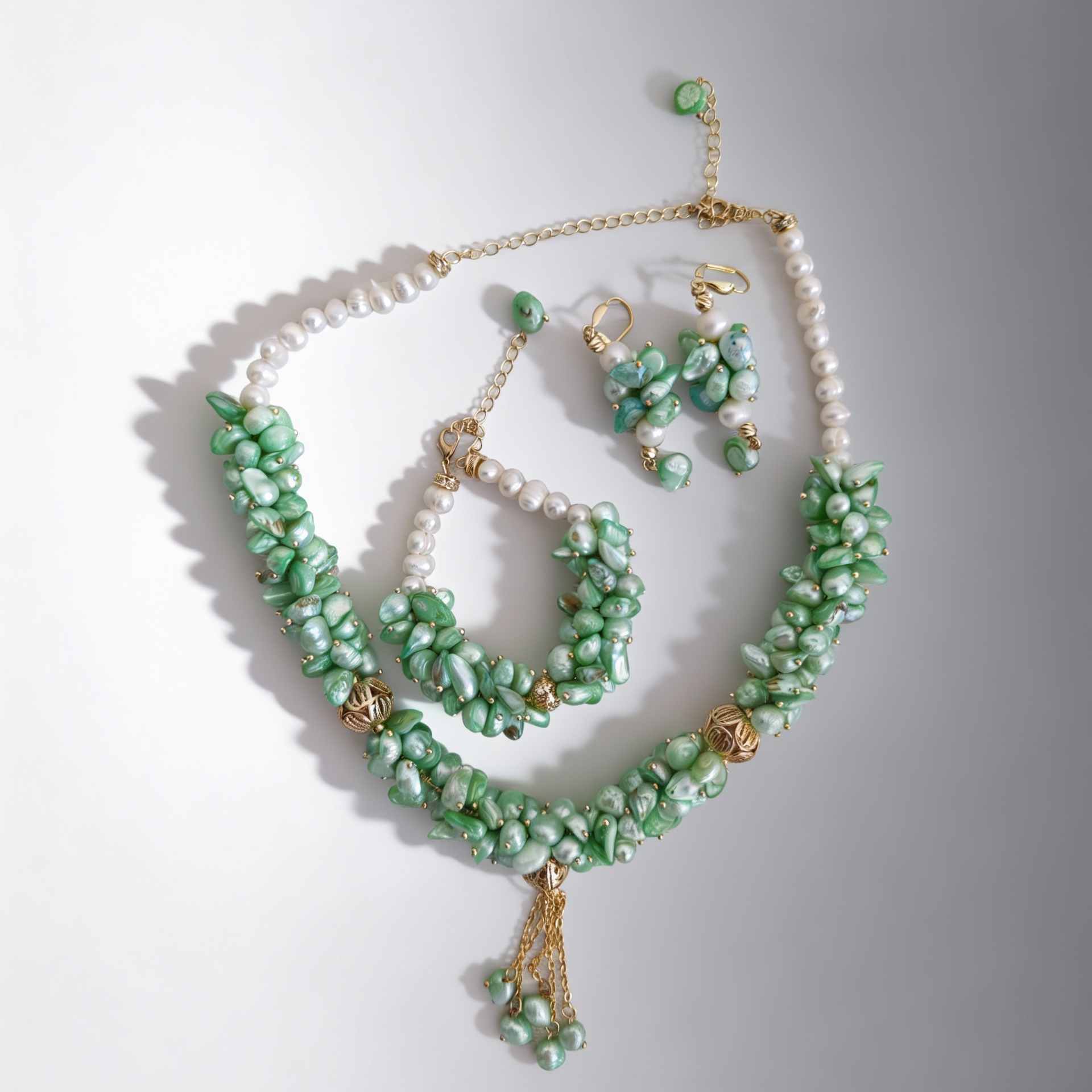 Be the first to review “Parure perle dents de mer verte et johar blanche et plaqué or avec motif”