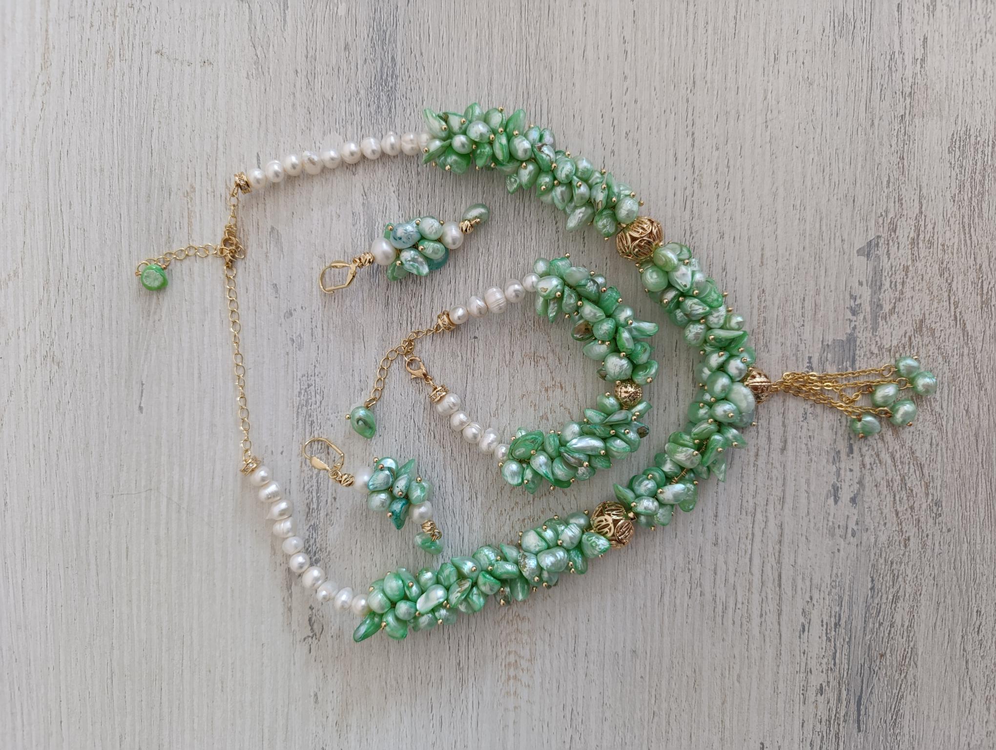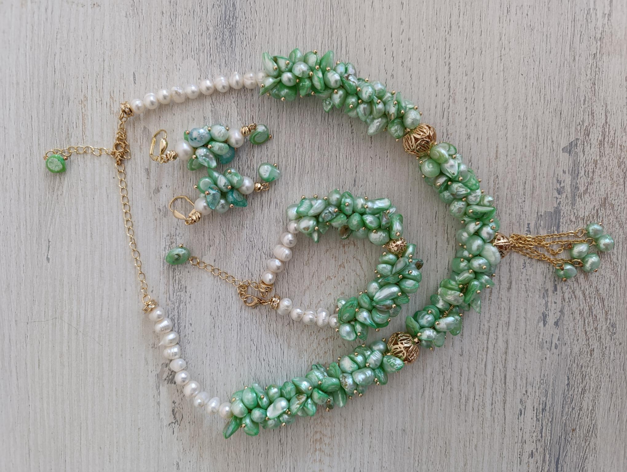 طقم dents de mer أخضر مع اللؤلؤ الأبيض و البلاكيور مع موتيف