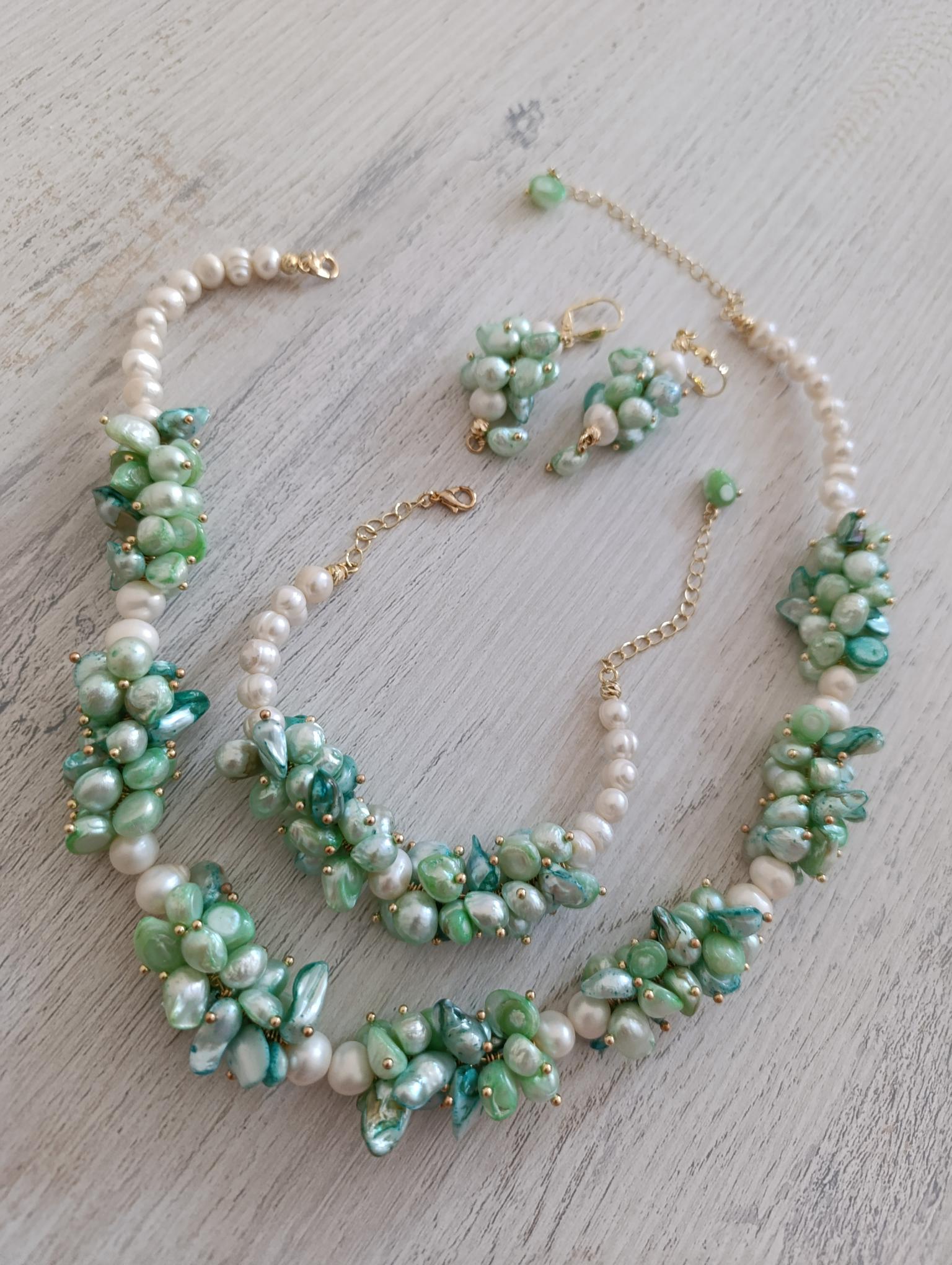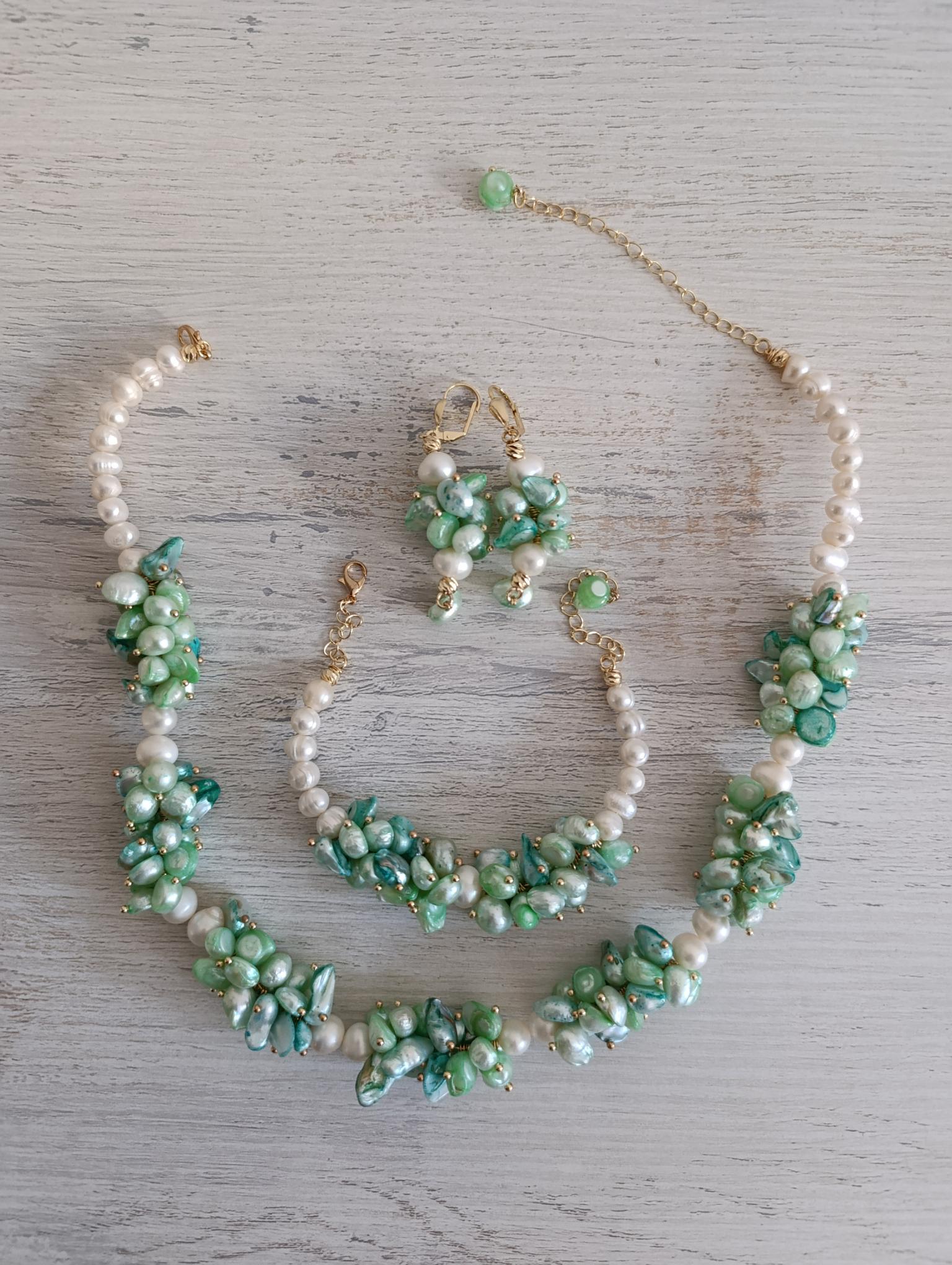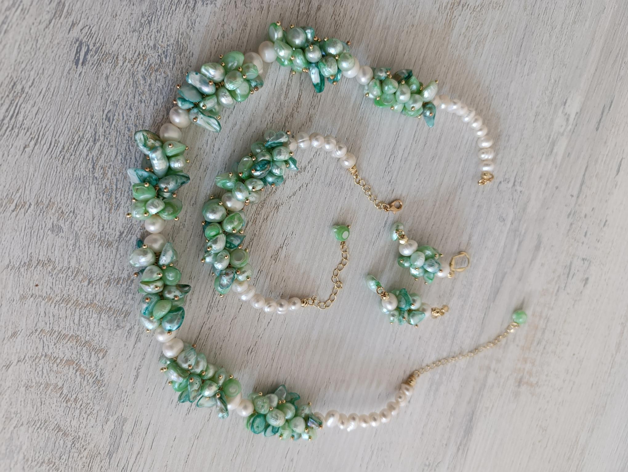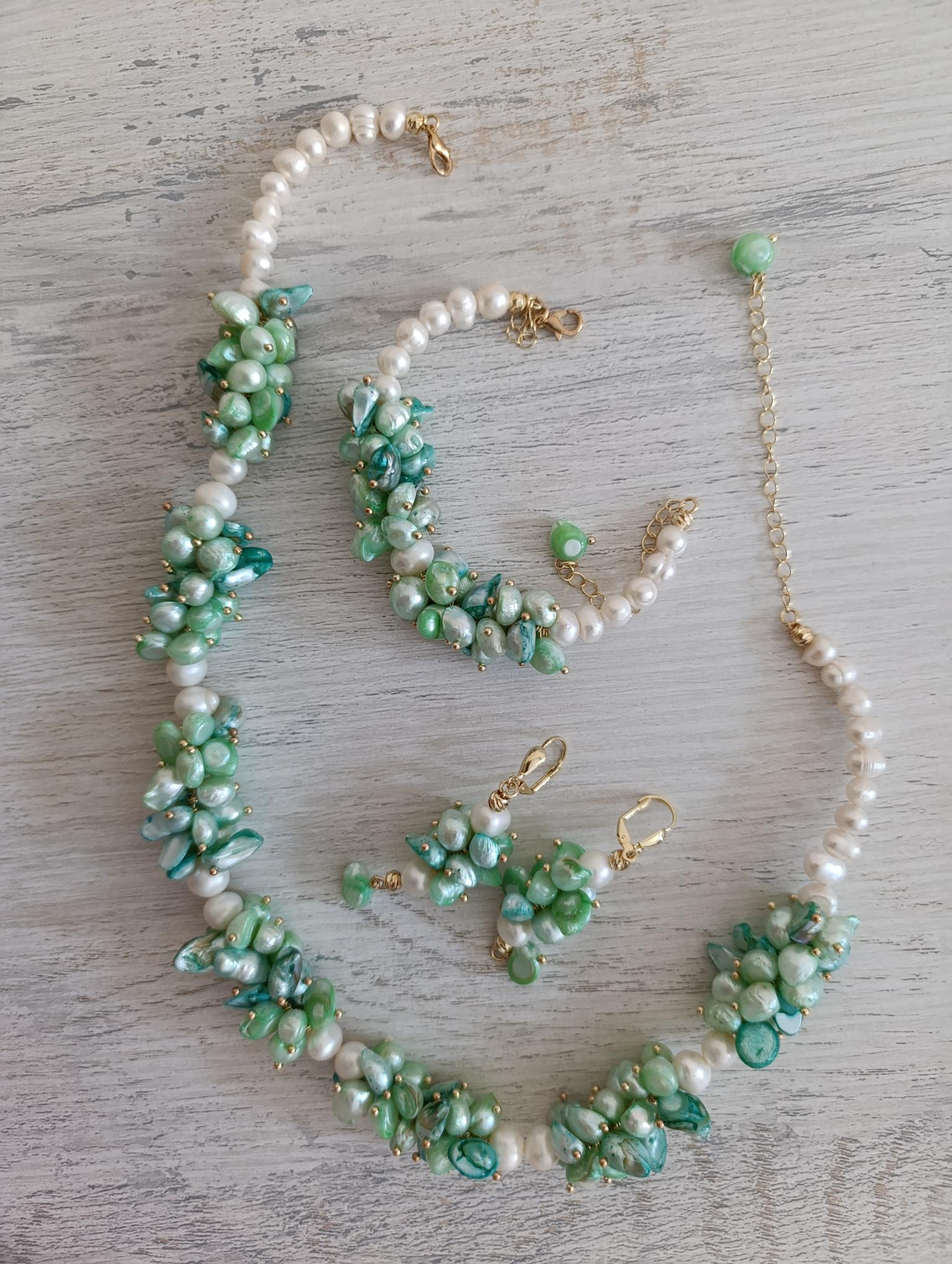 طقم dents de mer أخضر مع اللؤلؤ الأبيض و البلاكيور