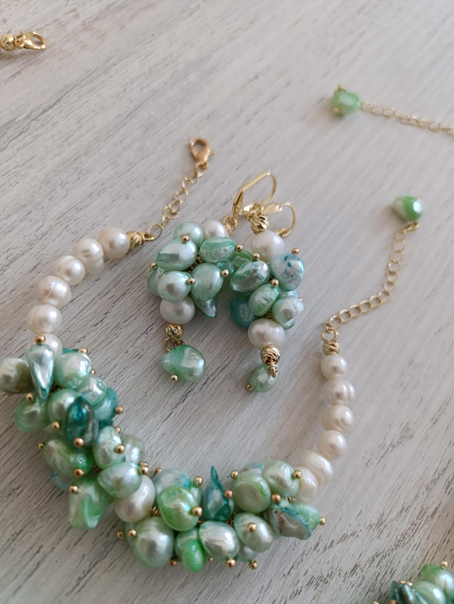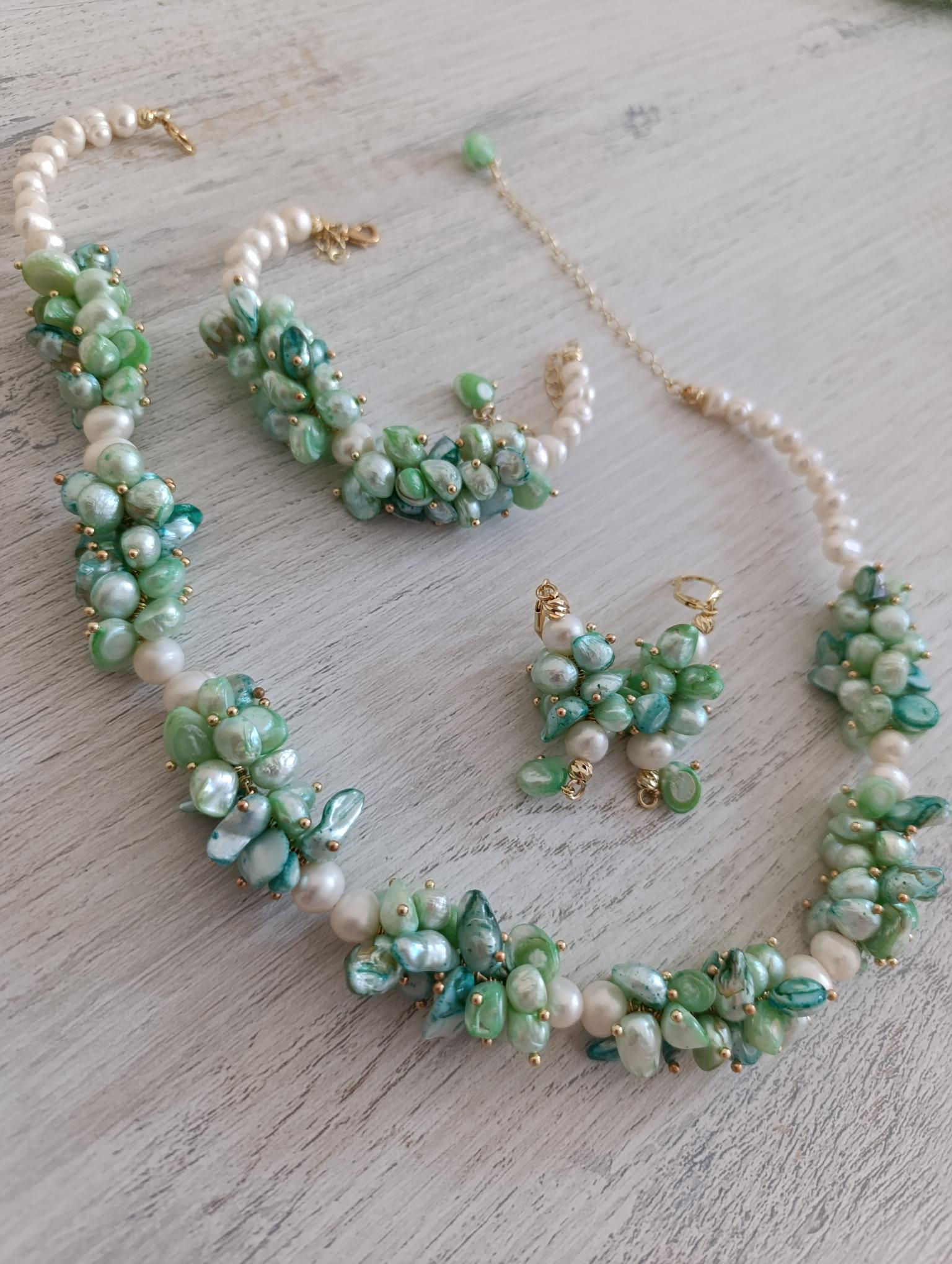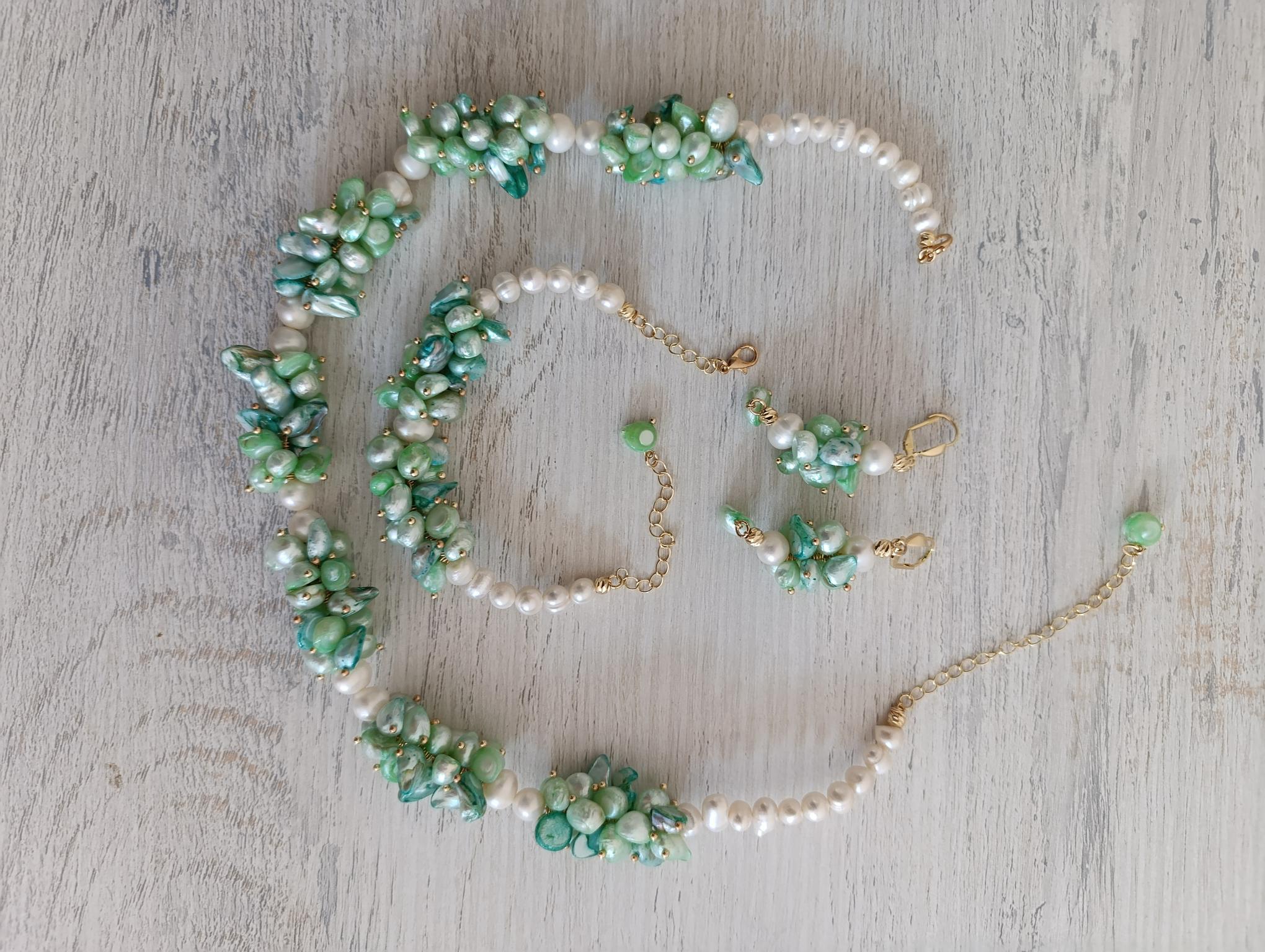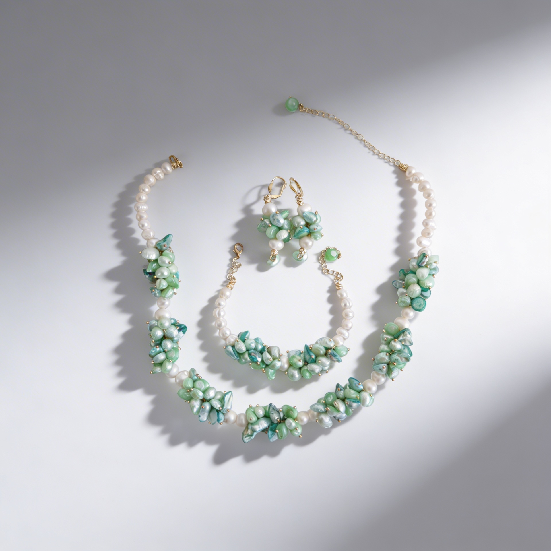 طقم dents de mer أخضر مع اللؤلؤ الأبيض و البلاكيور
