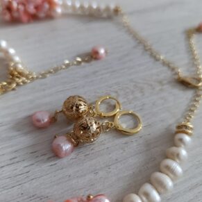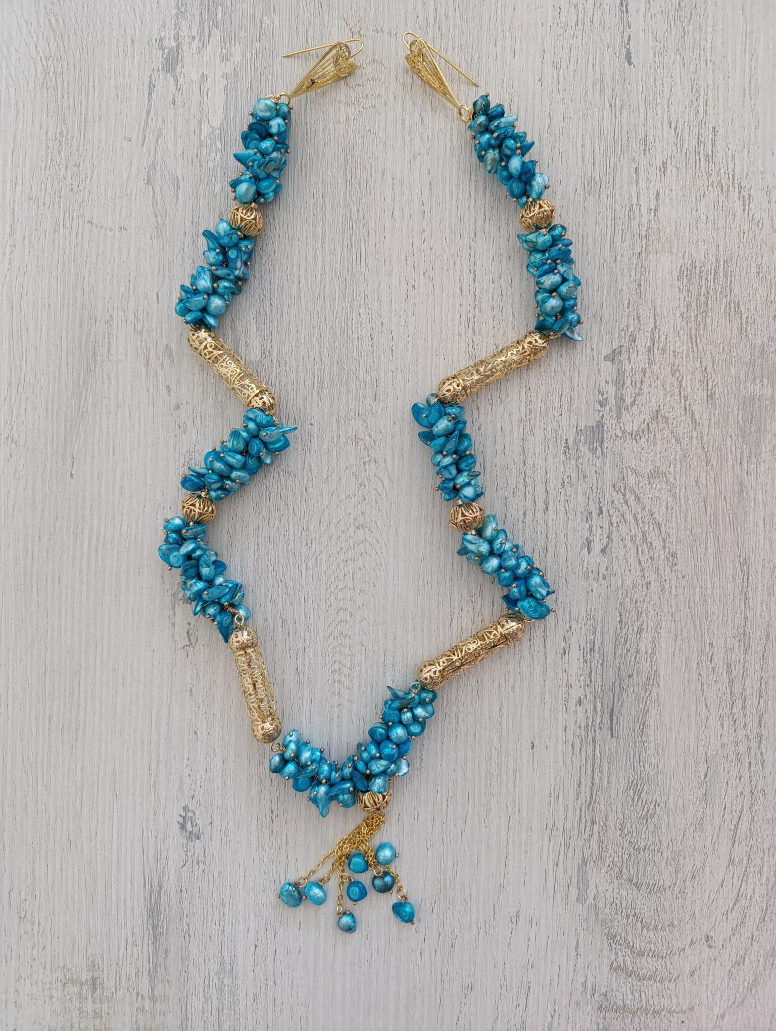 Be the first to review “Sautoir en perles dents de mer bleues avec plaqués or”
