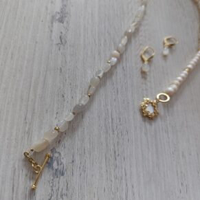 Sautoir en perles blanches et agate blanche avec boucles d’oreilles